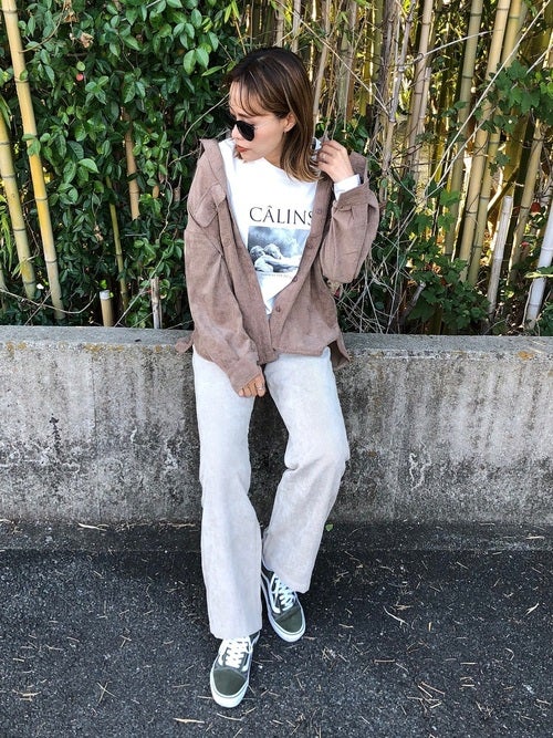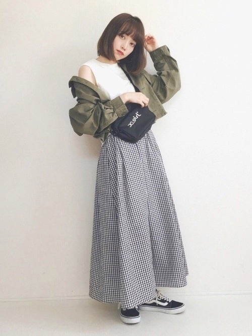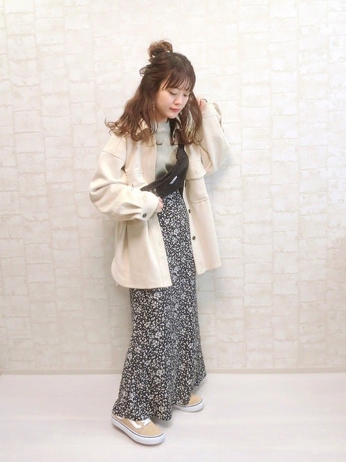今まではフラットパンプスで着こなしていたシャツジャケット+花柄マーメイドスカートのファッションも、足元をベージュのVANSオールドスクールスニーカーにチェンジするだけで、一気に旬のムードが高まりますよ。