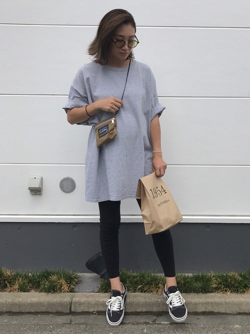 うっかり知り合いに会っても慌てないよう、グレーのチュニック丈Tシャツ&黒スキニーパンツに、人気の黒のVANSオールドスクールスニーカーを効かせて、さりげなくトレンド感を意識しましょう。