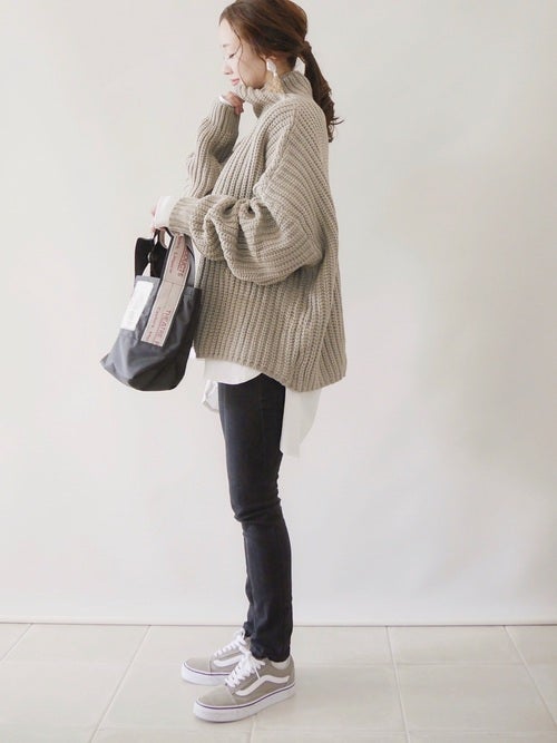 オーバーサイズなベージュのハイネックニットをメインに、黒スキニーパンツ+ベージュVANSオールドスクールスニーカーですっきりと大人めにまとめた人気レディースコーディネートです。