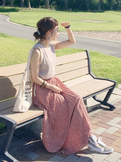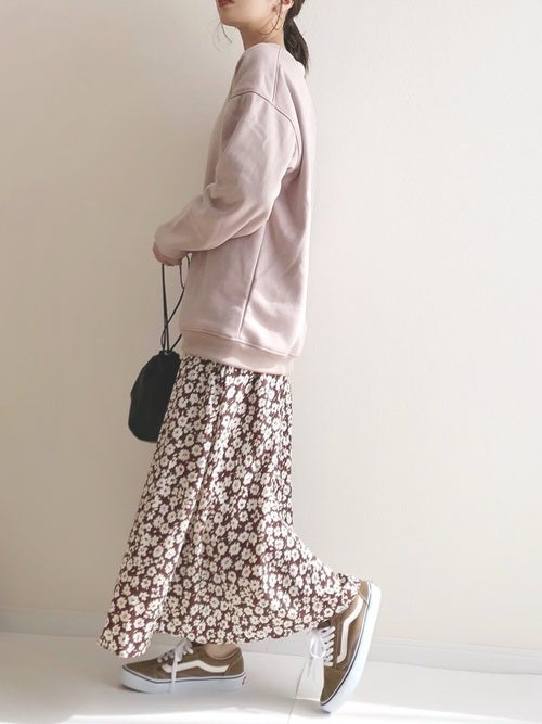 でも大人女性なら甘くなり過ぎるのは避けたいので、ベージュスウェット+ブラウン花柄スカートの着こなしに、VANSのオールドスクールスニーカーでスポーティーなニュアンスを添えたコーディネートがおすすめですよ。