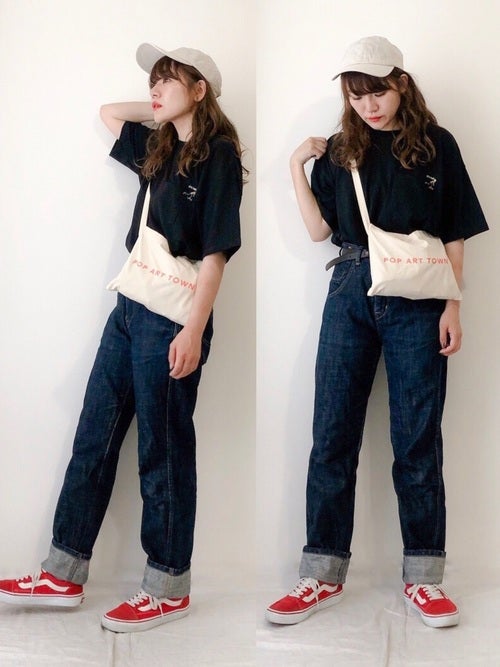 シンプルカジュアル派さんに人気の黒ロゴTシャツ&ストレートデニムのボーイッシュな夏コーディネート。