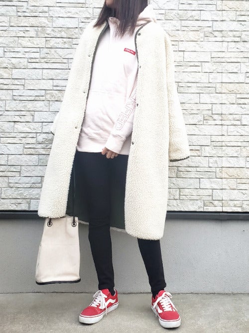 黒メインのシックなトレンドファッションに合わせるのはもちろん、クリーンな白パーカー&ボアコートを黒スキニーでスタイリッシュに仕上げた人気コーデともすんなりとなじみますよ。