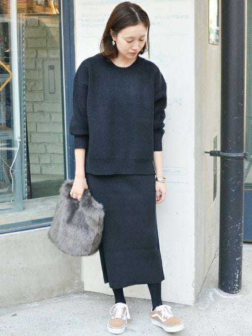 肌なじみのいいベージュのVANSオールドスクールスニーカーを、ネイビーのニットセットアップ合わせで大人っぽくきれいめにスタイリング。