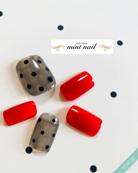 例えば、爪1~2本をシースルーブラックのドットネイルに、残りを鮮やかレッドでカラーリングするデザインはいかがでしょうか。ランジェリーを思わせるシースルーブラックのセクシーな雰囲気と鮮やかレッドの華やかな雰囲気がマッチした、素敵なネイルを楽しめます。