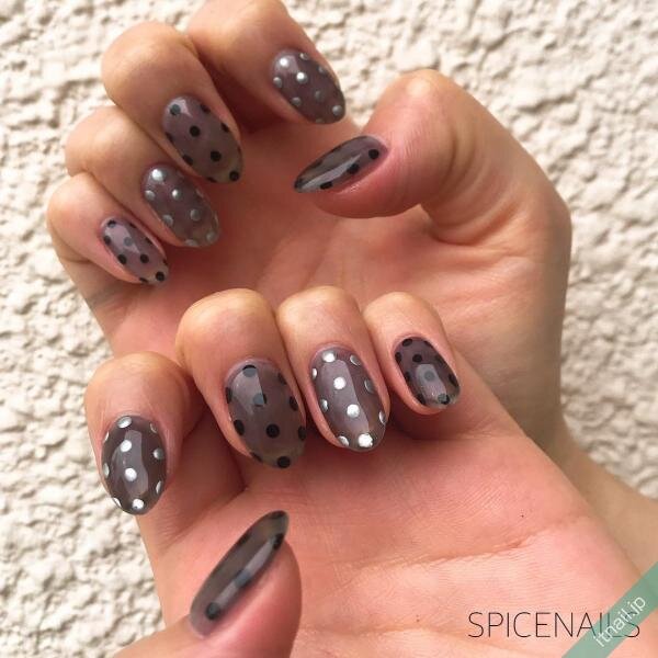 シースルーブラックのドットネイルは、この色をベースに、大きめのドット柄をアートしても可愛く仕上げられます。大胆に大きめサイズのドット柄を描くと、カジュアルでどこか懐かしさのある、お洒落ネイルを楽しめるでしょう。