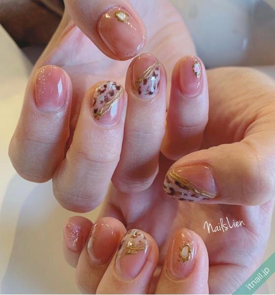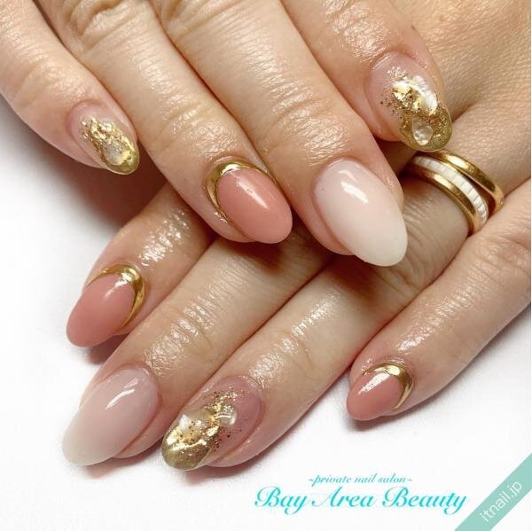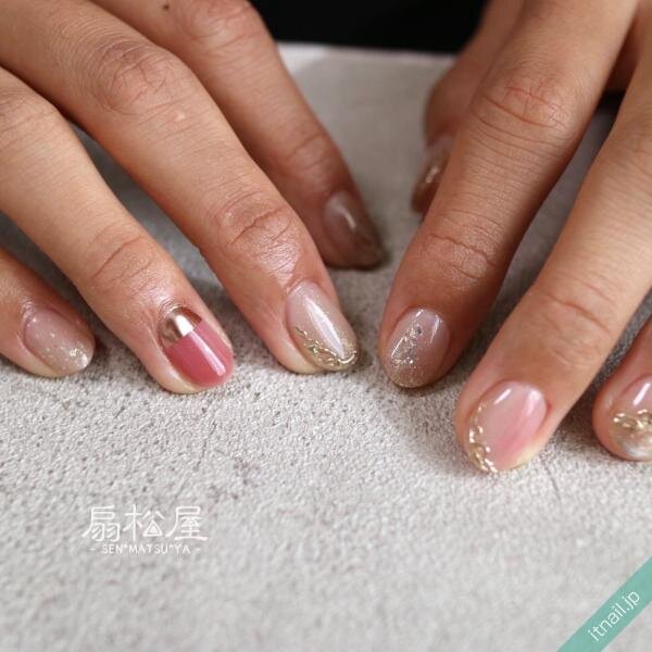 ナチュラルなベージュよりピンクで上品な指先を作ったら、ゴールドの装飾で華やかさをプラス。ピンクとゴールドはどちらもあたたかみのあるカラーで相性も抜群です。乳白色カラーの無垢なアクセントもGOOD。