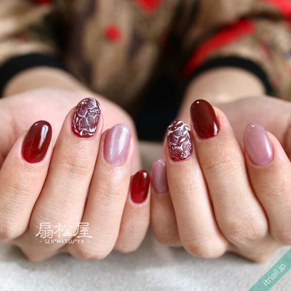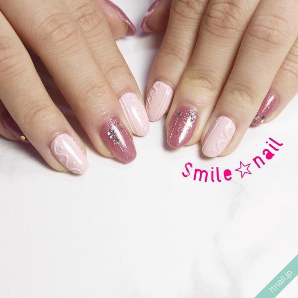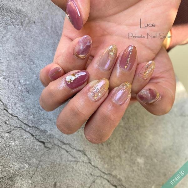 濃いめのくすみピンクで艶を楽しむ落ち着いた雰囲気のネイルデザイン。甘さを和らげて、大人スタイリッシュにまといたい配色です。装飾も含めたニュアンスたっぷりな雰囲気がオシャレ。