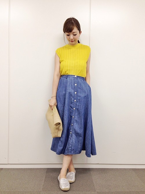 ウエスト周りはスッキリと、裾にかけて広がるAラインシルエットが特徴のデニムスカート。デニム素材でカジュアルな印象ながらも、ミディ丈にする事で大人っぽく着こなせます。