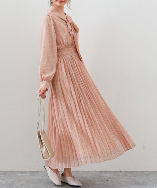 まずは春を代表する人気色、ピンクベースのドット柄ワンピースから見ていきましょう。
