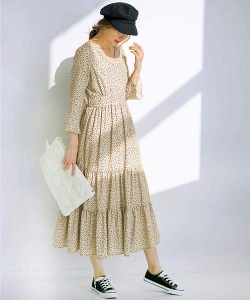 人気のベーシックカラーでもあるベージュのドット柄ワンピースは、フェミニンで優し気な着こなしが人気を集めています。