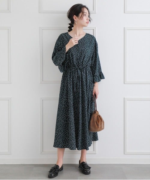 ダークグリーンにあしらわれたドットはサイズが小さめなので、上品な印象です。ウエストのドロストストリングでメリハリを付けたシルエットがおすすめ。