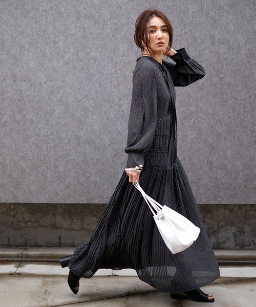 カシュクール、細プリーツ、緩プリーツと切り替えられたマキシ丈のワンピース。