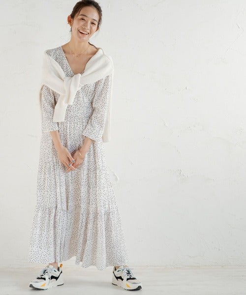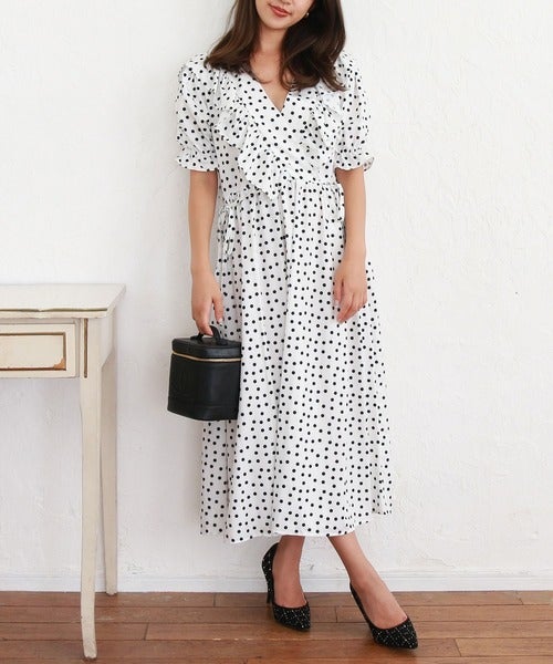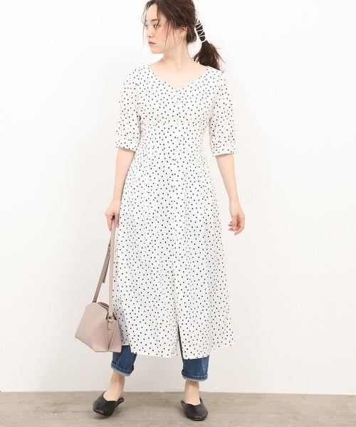 Vネックから鎖骨を出した華奢見せの着こなしが叶うドット柄ワンピースです。