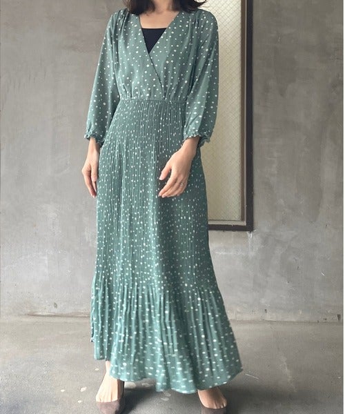 甘すぎないグリーンに白いドットをランダムに散らしたワンピースは、胸元がカシュクールデザインになっています。