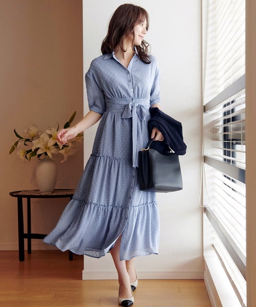 カジュアルな着こなしが楽しめるシャツワンピースも、ロマンティックなティアードデザインを選ぶと大人女性にもおすすめのきれいめファッションになります。