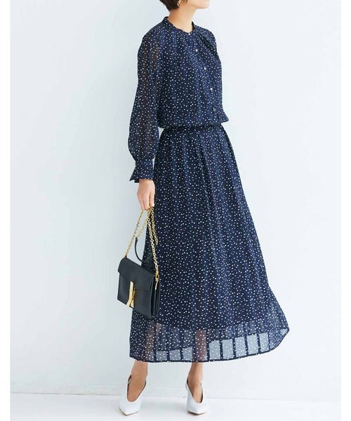 トレンドのシアー感があるジョーゼット素材のドットワンピースは、足首までのマキシ丈。