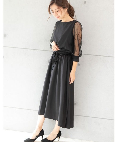 ドットチュールの袖が、適度な透け感を生み出しているドレスワンピースです。肌見せ面積が抑えられているので、清楚感も失っていません。