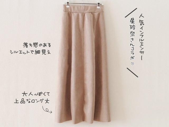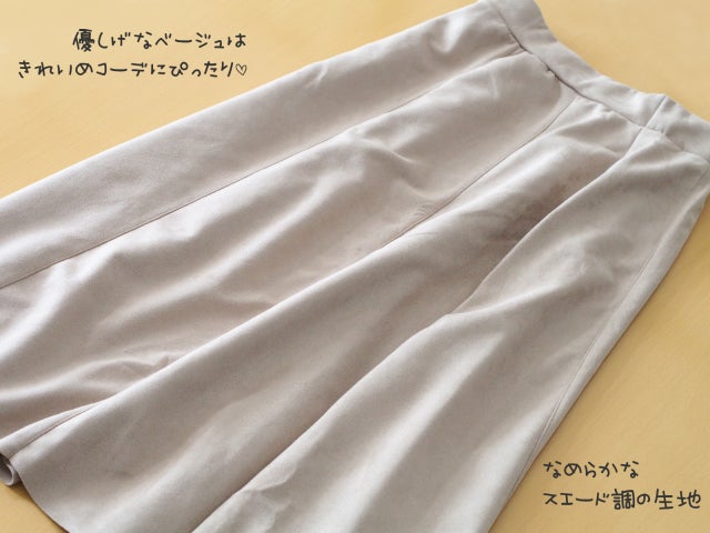 スエード調の生地は、なめらかで柔らかい肌触り。優しげな印象のベージュがキレイめコーデによく似合います。