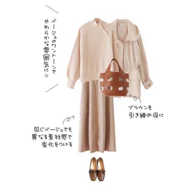 柔らかな印象のベージュワントーンコーデ