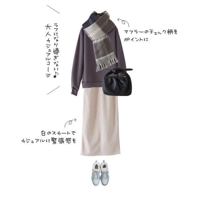 パーカーにロング丈のタイトスカートを合わせた休日スタイル。白のスカートでカジュアルな着こなしに緊張感を持たせて、大人っぽく仕上げました。存在感のあるマフラーのチェック柄を、コーデのポイントに。
