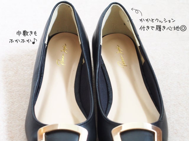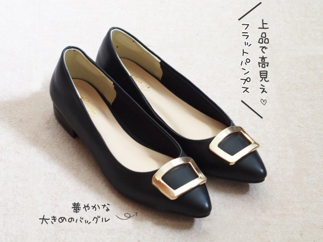 フラットパンプスは、細いつま先が足元をきれいに見せてくれる一足。ぱっと目を引く大きめのバックルが華やかな雰囲気です。