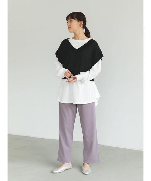 いつものトップスに重ねるだけで骨格ストレートさんの春コーデにこなれ感やトレンド感が出るVネックショート再生ポリエステルビスチェ風ベスト。