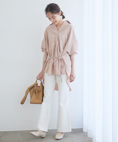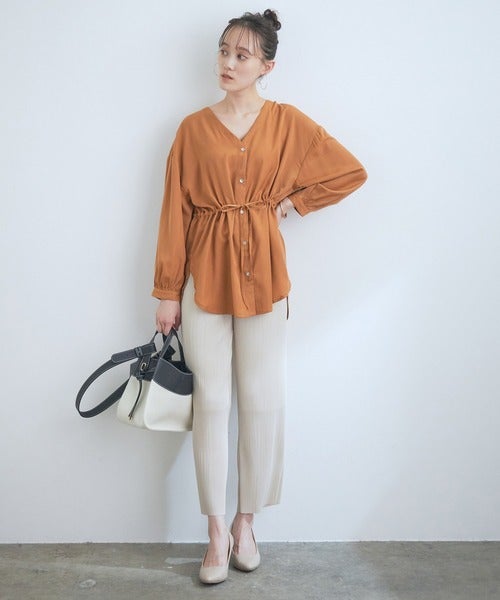 ウエストのドロストデザインで骨格ストレートさんの春コーデにメリハリがつくVネックウエストドロストブラウス。