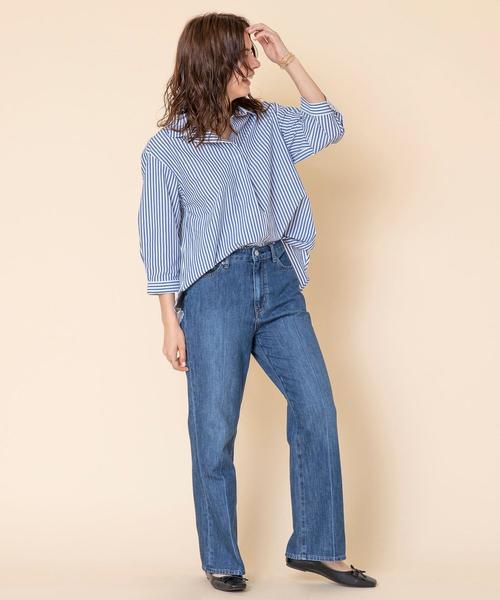 春らしいさわやかさを演出してくれるブルーストライプのボイルダンプ7分袖スキッパーシャツ。