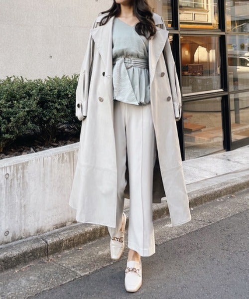 ブラウス自体も上品できれいめな印象のデザインになっていますが、センタープレスパンツやトレンチコートならきちんと感のあるアイテムと合わせて使っていることで、大人の骨格ストレートさんに似合う上品な春コーデに仕上げることができていますね。