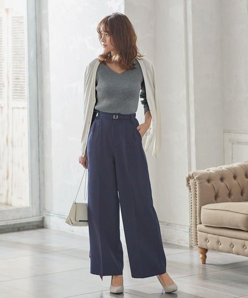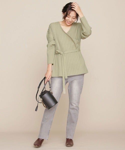 ウエストにリボンがついていることで、メリハリのあるラインを作り骨格ストレートさんのスタイルアップ効果を最大限に引き出してくれるワイドリブカシュクールニット。