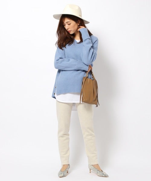 ブルーのVネックAQUAニットに白系のアイテムたちを合わせることで、春に似合うさわやかな着こなしに。
