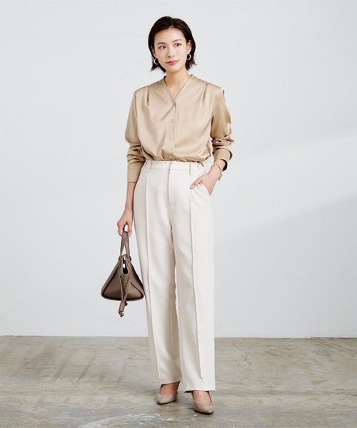 光沢のある素材のサテンVネックタックブラウスは、中でも上品さが格別で骨格ストレートさんの通勤コーデやオフィスコーデに似合うアイテムになっています。