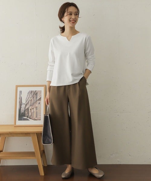 トップスの裾をウエストインせずゆったりめに仕上げたコーディネートでもラフになりすぎないのが、スキッパートップスのいいところ。