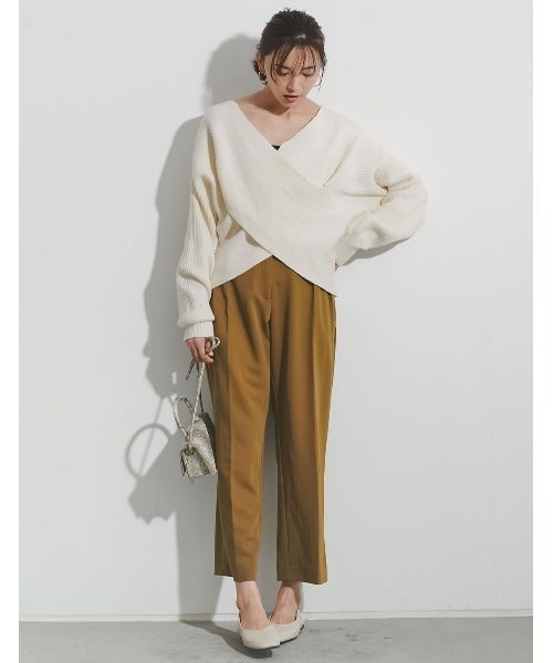 定番のニットトップスも、フロントカシュクールデザインのものだと新鮮味ある着こなしの春コーデが完成します。