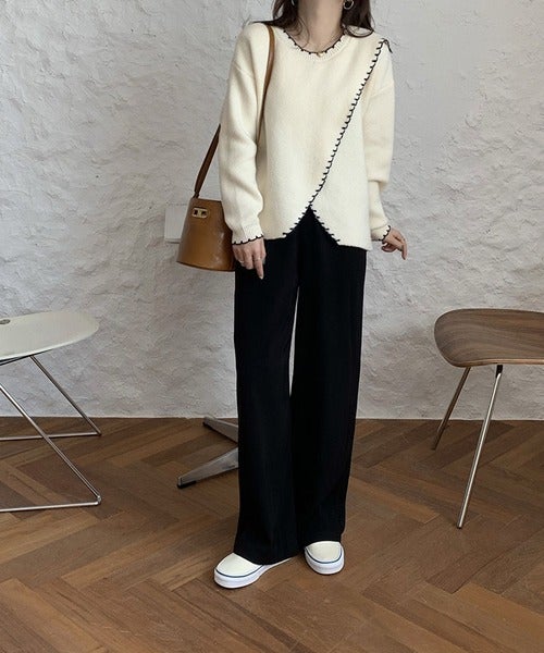 春に着ると物足りなさを感じがちなモノトーンコーデも、配色ステッチカシュクールニットプルオーバーのおかげで存在感を放っていますね。