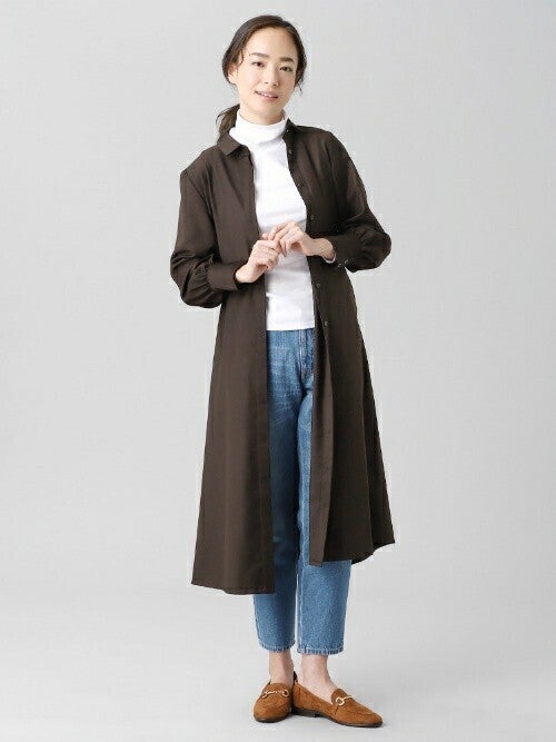 40代の女性ミニマリストさんのみならず、誰もがクローゼットに一着は持っているロングシャツワンピース。2021年秋は、着回しに便利なダークブラウンのアイテムを軽い羽織りとして活用したファッションがおすすめですよ。インナーは、ミニマリストさんらしい白ハイネックニット+クロップド丈デニムのベーシックな服装が◎。