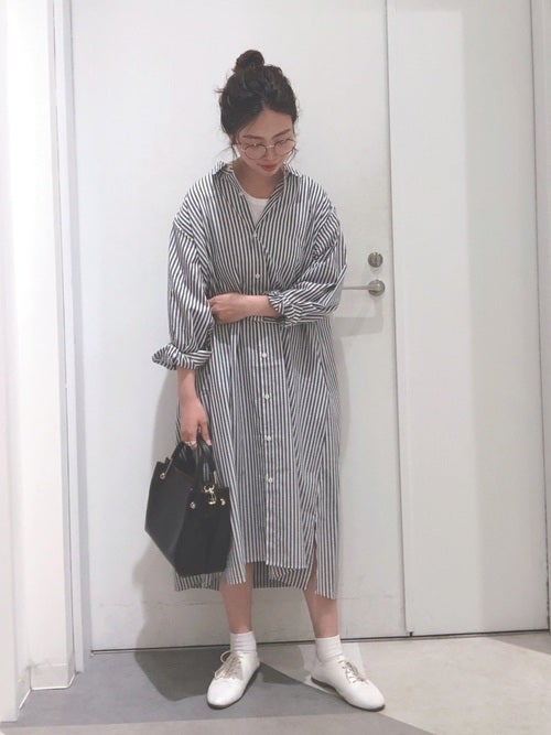 ミニマリスト=無地のお洋服しか着ない、と思い込んでいる40代女性も意外に多いよう。でも、ミニマリスト向けコーディネートのマンネリ打破のためにも、やはりアクセントになる柄アイテムは何点か持っておくのがベターですよ。中でも一推しは、縦シルエットを強調してくれるストライプ柄のシャツワンピース。白ソックス&白レースアップシューズを組み合わせて、春らしく透明感のあるおしゃれな着こなしにまとめましょう。
