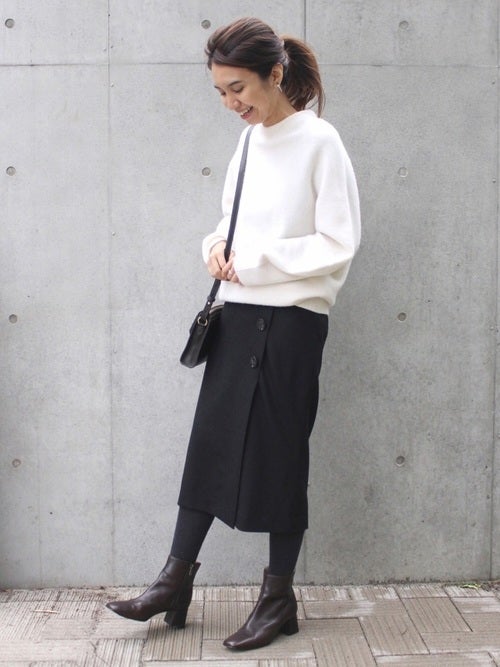 シンプルな秋コーディネートが好みだけれど、人と被る着こなしはしたくない…。そんな40代のミニマリストさんには、ピュアな白ニットに黒のボタン付きタイトスカートを組み合わせた、上品なスカートの服装がおすすめですよ。クリーンな雰囲気が40代女性ならではの大人の可愛らしさを引き立ててくれるので、デート向けのファッションにもうってつけですね。