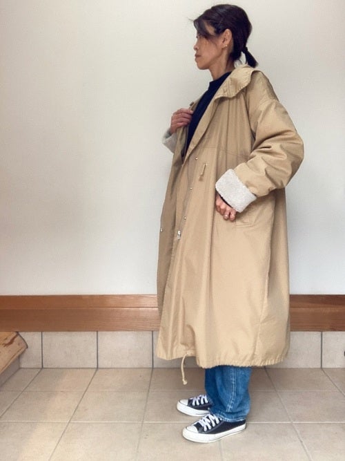 インナー次第でオールシーズン着回せるベージュのロングコートは、2021年40代のミニマリストさんならぜひチェックしておくべきレディースアイテムのひとつ。冬らしく寒い日には、暖かな黒スウェット&ゆるデニムをコーデして、暖かさとおしゃれ感をを重視した、ミニマリストさん向けの服装にまとめましょう。