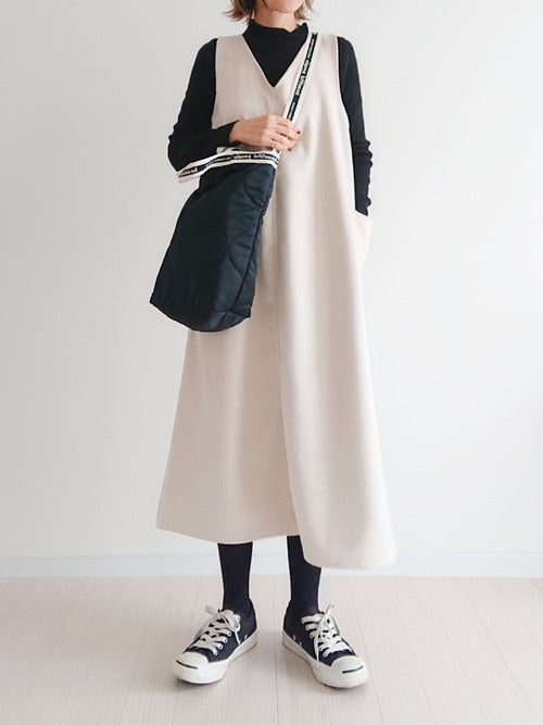 女性らしい冬コーディネートに欠かせないワンピースですが、40代ミニマリストさんの中には「着回ししにくいから、必要ないのでは?」と考えている人も多数なよう。でもインナーに重ね着できるロング丈のVネックのアイテムなら、実はオールシーズン着られて元取れ度は◎。真冬は黒ハイネックニット+黒スニーカーで、きれいめカジュアルな服装にまとめるのがおしゃれな40代ミニマリストさんにおすすめの着こなしテクニックです。