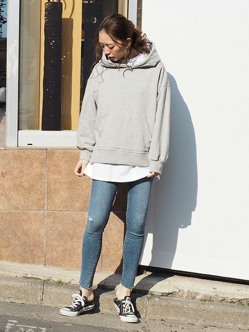 ちょっとしたご近所へのお出かけやお買い物に重宝する服装が、女性ミニマリストさんにマストなグレーのパーカー。ひと昔前の印象にならないよう、2021年春ならリラクシーに決まるオーバーサイズなアイテムが正解ですよ。ボトムスはワイドパンツでも合いますが、ぴったりと脚にフィットするスキニーデニムならメリハリのあるミニマリストさん向けのコーディネートに。