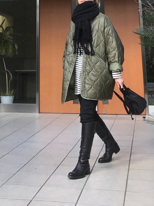 寒い冬の季節のコーディネートは、ついワンパターンな服装になりがちですよね。そんな時は、40代女性ミニマリストさんなら誰もが持っているであろう、ボーダー柄アイテムをファッションのポイントにしてみてはいかがでしょうか。特にヒップの隠れるチュニック丈のボーダートップスは、人気のミディアム丈キルティングコートとも相性のいい便利アイテムですよ。下半身は、黒デニム+ロングブーツの組み合わせで自然に繋げて、おしゃれ感だけでなくスタイルアップ効果も狙いましょう。
