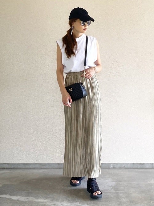 パンツ派の40代女性ミニマリストさんだと、デニムやワイドパンツがメインになりがちな夏コーディネート。でも、少ない服でたくさんの着回しを楽しむには、スカートも持っておくと便利ですよ。ポイントは、カジュアルにもきれいめにもアレンジできるアイテムを選ぶこと。中でも光沢のあるロングプリーツスカートは、+白ノースリーブでシンプルに着こなしてもおしゃれに仕上がるので、ぜひミニマリストさんの夏用ワードローブに追加しておきましょう。