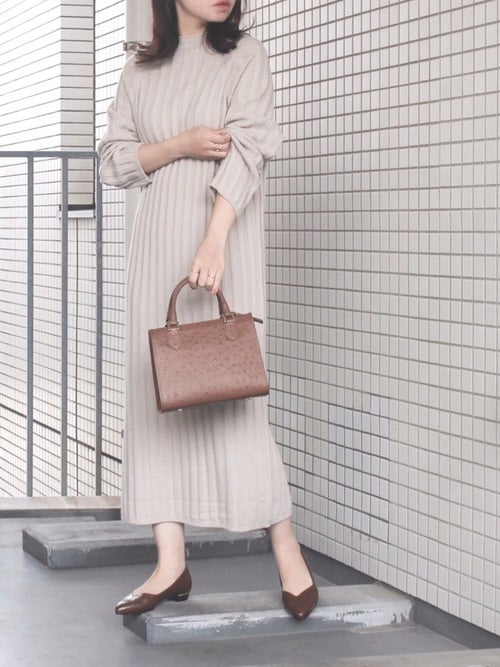 働くミニマリストの40代女性にとって、オフィスカジュアル向けのコーディネートは悩みどころのひとつですよね。ベーシックなシャツやパンツなどの他にも、画像のような優しいベージュのニットワンピースを一着クローゼットに持っておくと、きれいめな春ファッションをしたい日に重宝しますよ。バッグとシューズはブラウン系のアイテムで統一して、着こなしにまとまり感を出すのがおしゃれなミニマリストさん向けの服装に仕上げるポイントなんです。