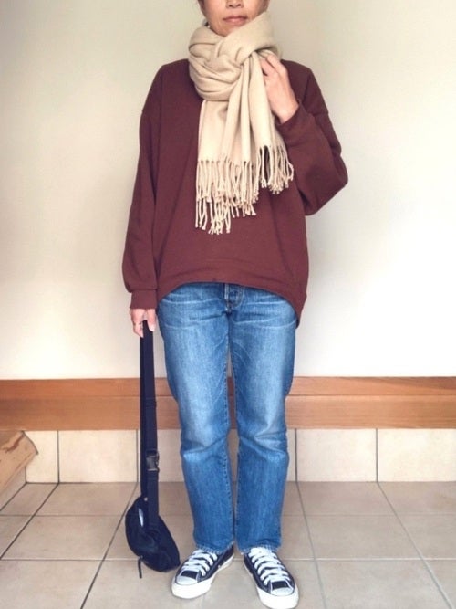 必要最低限のアイテムで着回しコーディネート楽しむ40代の女性ミニマリストと言えども、クローゼット残すべきマストなお洋服と言えば、やはり体に馴染んだデニムパンツですよね。特に付かず離れずのシルエットが40代の体型カバーにも◎なストレートデニムは、手離さないでデイリーの秋ファッションにどんどん活用しましょう。2021年秋なら、トレンドカラーのブラウンのトップスに顔映りのいいベージュのマフラー合わせで、シーズンムードをしっかりと取り入れたコーディネートにまとめるのがおすすめです。