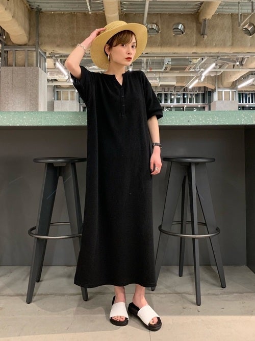 40代女性向けの服装「黒半袖ワンピ×白サンダル」