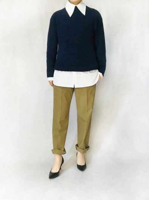 ミニマリストさんのお仕事用秋コーディネートに活躍するのは、やはり王道の白シャツ+黒ニットのスタイリッシュな組み合わせ。ボトムスはどんなアイテムでも合いますが、2021年秋らしいミニマリストさん向けのファッションを目指すなら、ニュアンスのあるベージュのチノパンツをセレクトしてみてはいかがでしょうか。足元は、正統派な黒のヒールパンプスが好相性ですよ。