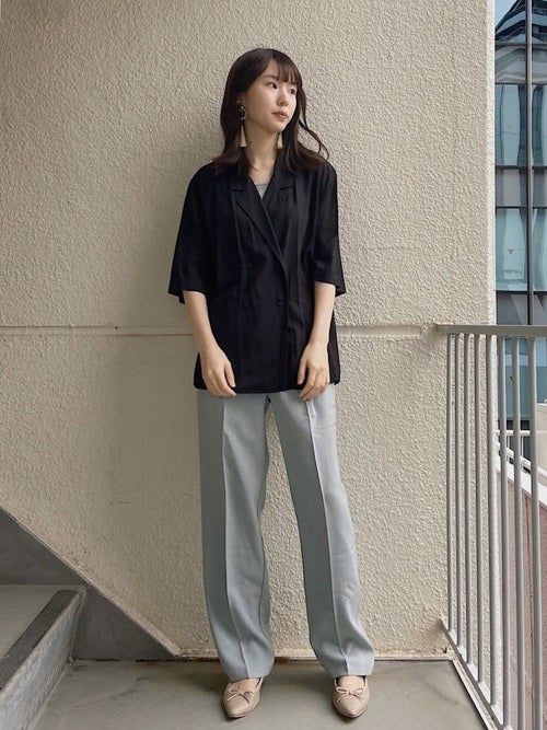 着回し上手な40代ミニマリストさんならではの夏服選びのポイントは、パッと見はシンプルでも、実は一捻りあるアイテムを選ぶこと。プレーンな黒の半袖シャツも、画像のような開襟デザインのアイテムなら、おしゃれ見え確実ですよ。ボトムスは定番のグレーのセンタープレスパンツで40代女性ミニマリストさんらしくシャープなコーデにまとめつつ、ベージュのパンプスで全身を柔らかくなじませましょう。