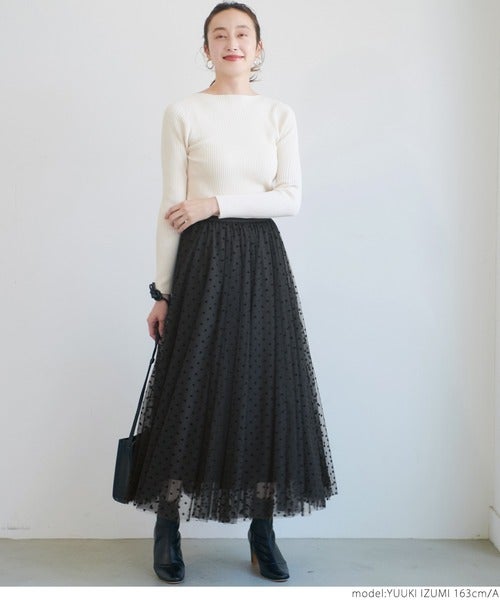 フレンチカジュアルコーデをシックに仕上げる、ドット柄のチュールスカート。