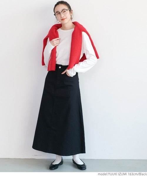スカートが目を引くので、他のアイテムはシンプルに統一するのがポイント。